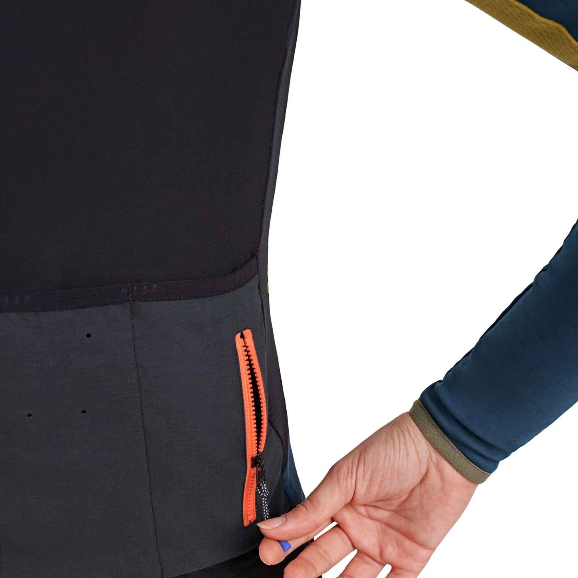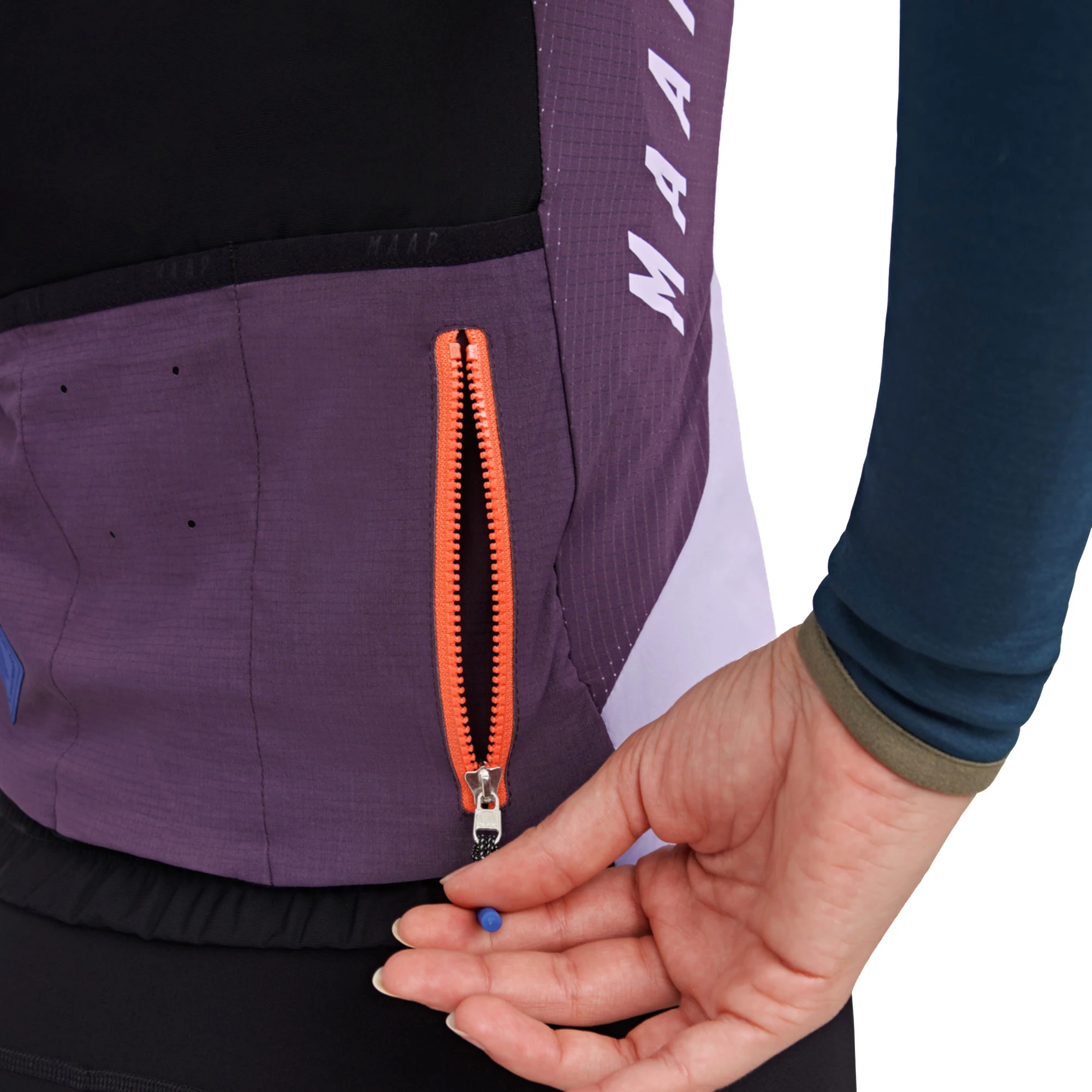 MAAP’s Alt_Road Womens Thermal Vest combines a windproof, insulated front with breathable side panels so that the core of the body is well protected in cool conditions without becoming sweaty and damp. The Polartec Alpha lining retains heat whilst still allowing any moisture to escape and the DWR treatment on the windproof fabric ensures that light rain and road spray doesn’t penetrate the vest.