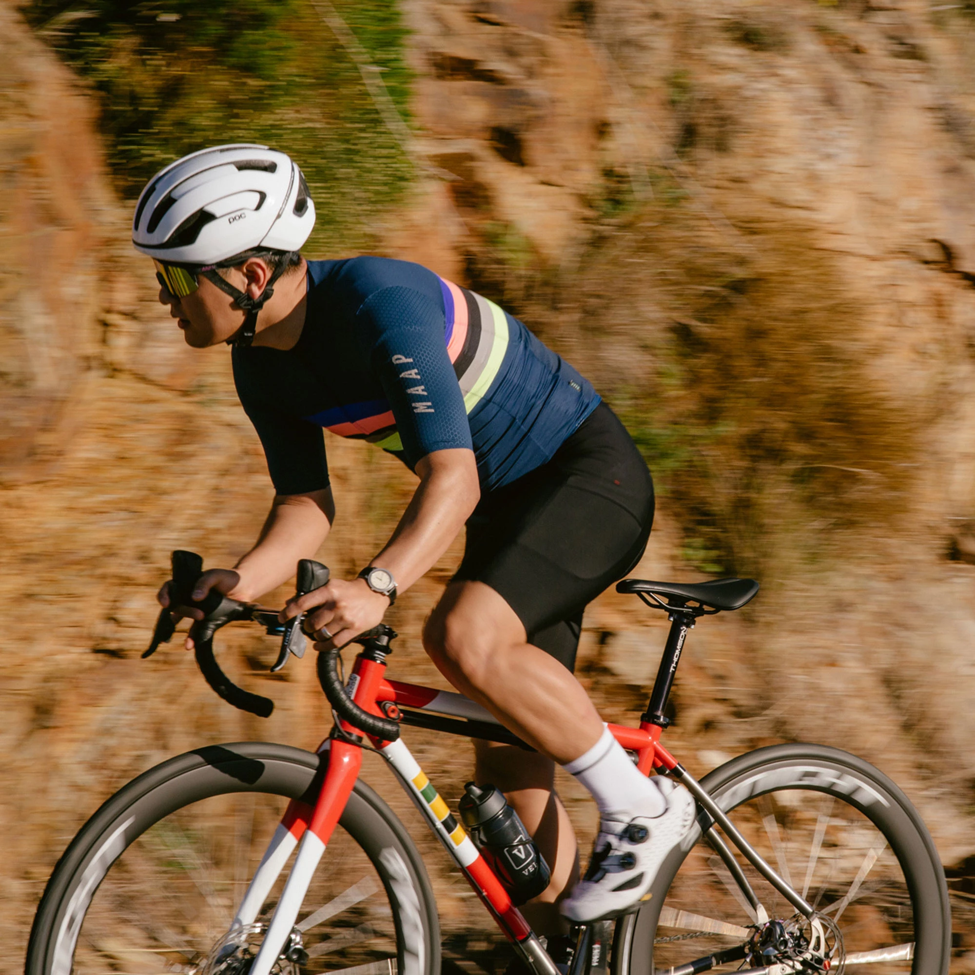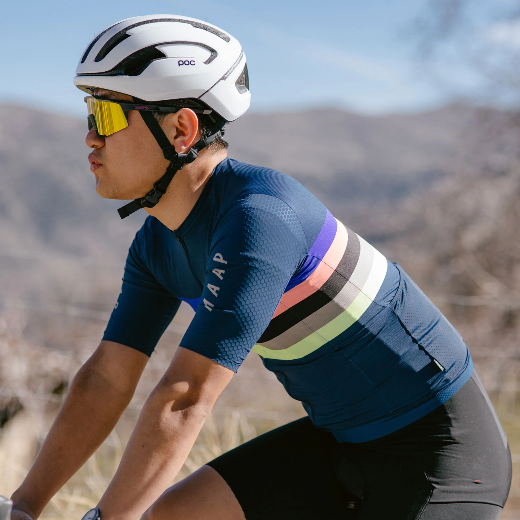 Style and performance are both well catered for in the MAAP New World Pro Hex Short Sleeve Jersey. It utilises the brand’s Pro Fit, that is contoured and hugs the body without restricting movement, and fits optimally in the riding position. The combination of a breathable perforated mesh used for the back, sides and collar with a 4D woven Hex-tech® on the longer-length sleeves ensures comfort, moisture management, improved aerodynamics and excellent protection from the sun.